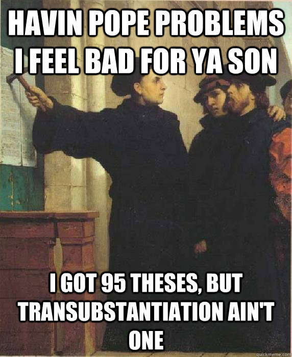 October 31, 1517, Martin Luther posted his 95 Theses in confronting the false doctrine of the universal (catholic) church.  So in honor of Reformation Day, I am posting the 95 Theses as a reminder and refresher.  Thanks to the Spurgeon Archive for making these available so that I did not have to retype the whole thing.  As for the graphic above, I couldn’t resist.  I have been entrenched in Catholic dogma for the last few weeks which always makes me feel like the proverbial dog returning to his spiritual vomit.   Irreverent…maybe, true…absolutely, apology…not a chance!  Enjoy: