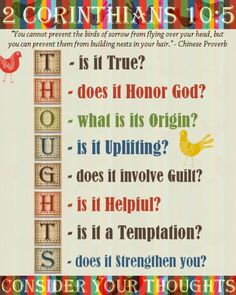 The ability to have any success in taking every thought captive is rooted in spiritual disciplines, specifically to know the Word of God, to pray, to mediate and to journal (Psalm 119:1-16). Other disciplines will support these, but you have no means of distinguishing a God pleasing thought from a thought of darkness if you do not scrutinize it under the light of scripture. The desire to even think this comes from the Holy Spirit and prayer (John 16:8-9). As we have communion with God through His word and prayer, the Holy Spirit in us prays for us with groaning too deep for words (Romans 8:26).